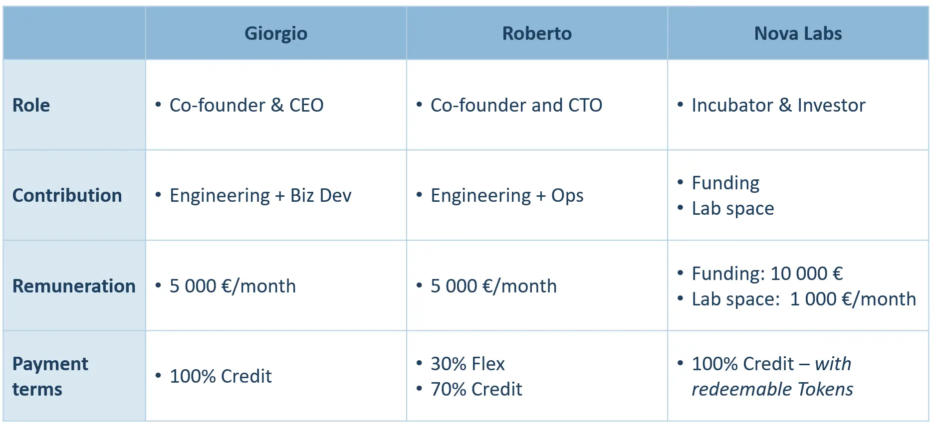 Giorgio and Roberto are not yet salaried but are dedicating most of their time to the venture. Lorenzo wants to ensure they are fairly rewarded for their efforts, even in this early, pre-revenue phase.